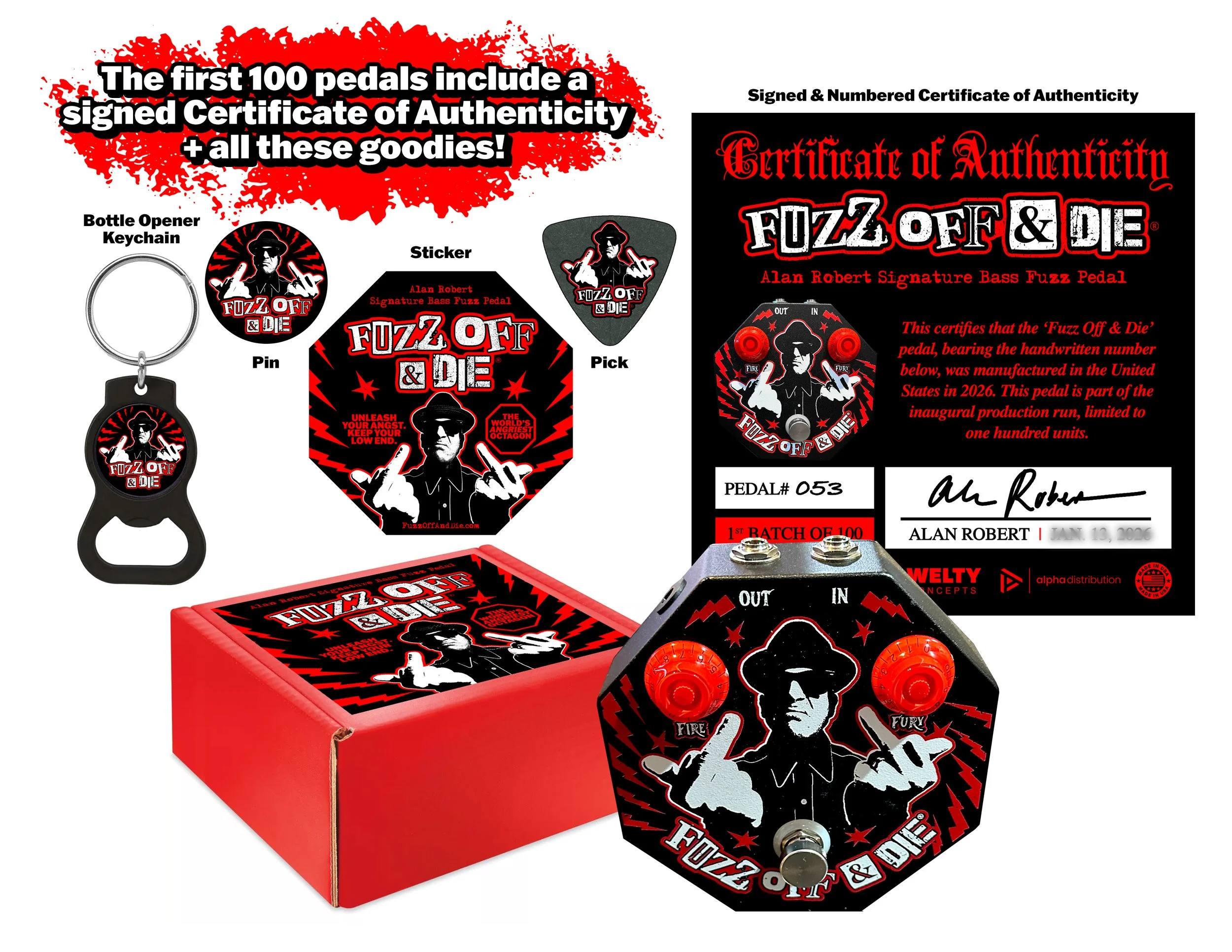 Introducing the Fuzz Off & Die signature bass fuzz pedal, created by Alan Robert (Metal Hall of Fame bassist for Life of Agony), and engineered by gear legend Terry Welty (Geezer Butler’s Ashdown Head of Doom amp, EMG GZR pickups, tech for Black Sabbath and Foreigner).